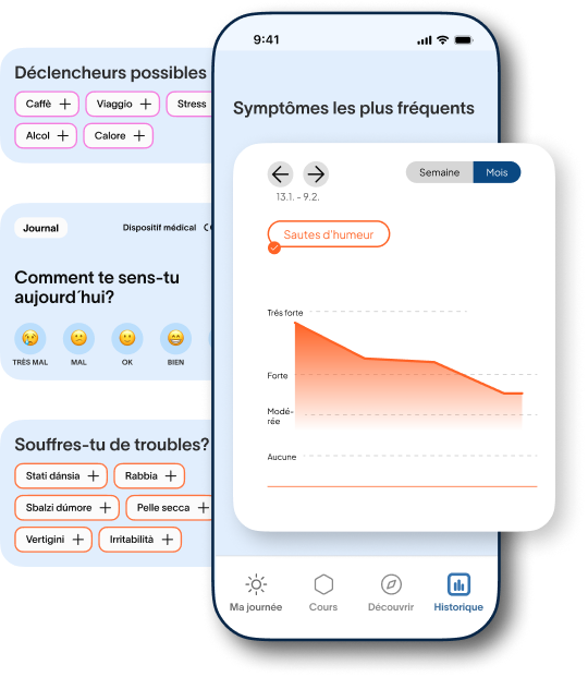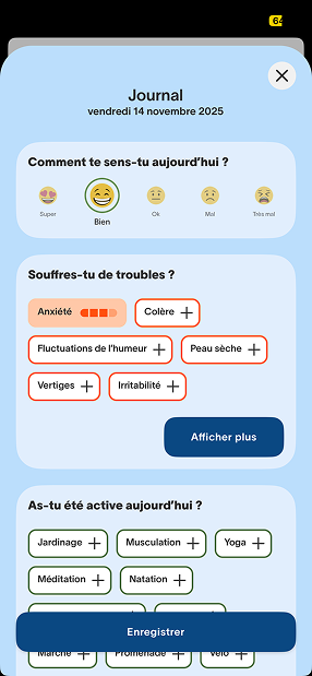 La fonction de suivi permet d'enregistrer quotidiennement l'humeur, les symptômes de la ménopause, les règles, les activités, la prise de médicaments et de compléments alimentaires, les déclencheurs possibles et une entrée de journal dans un champ de texte libre.