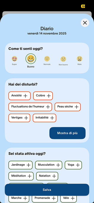 Con la funzione di monitoraggio è possibile registrare quotidianamente l'umore, i disturbi della menopausa, il ciclo mestruale, le attività, l'assunzione di farmaci e integratori alimentari, i possibili fattori scatenanti e un diario tramite un campo di testo libero.